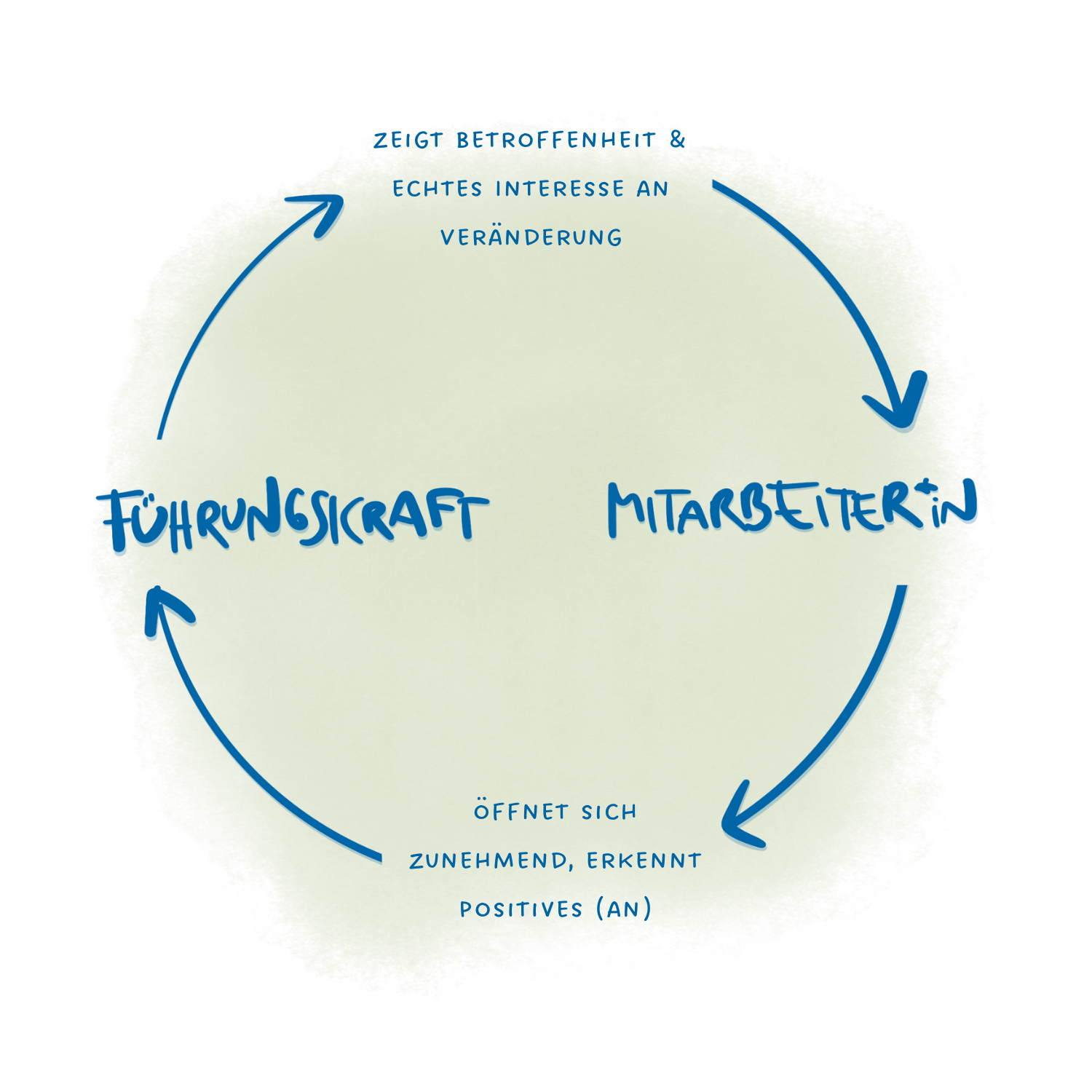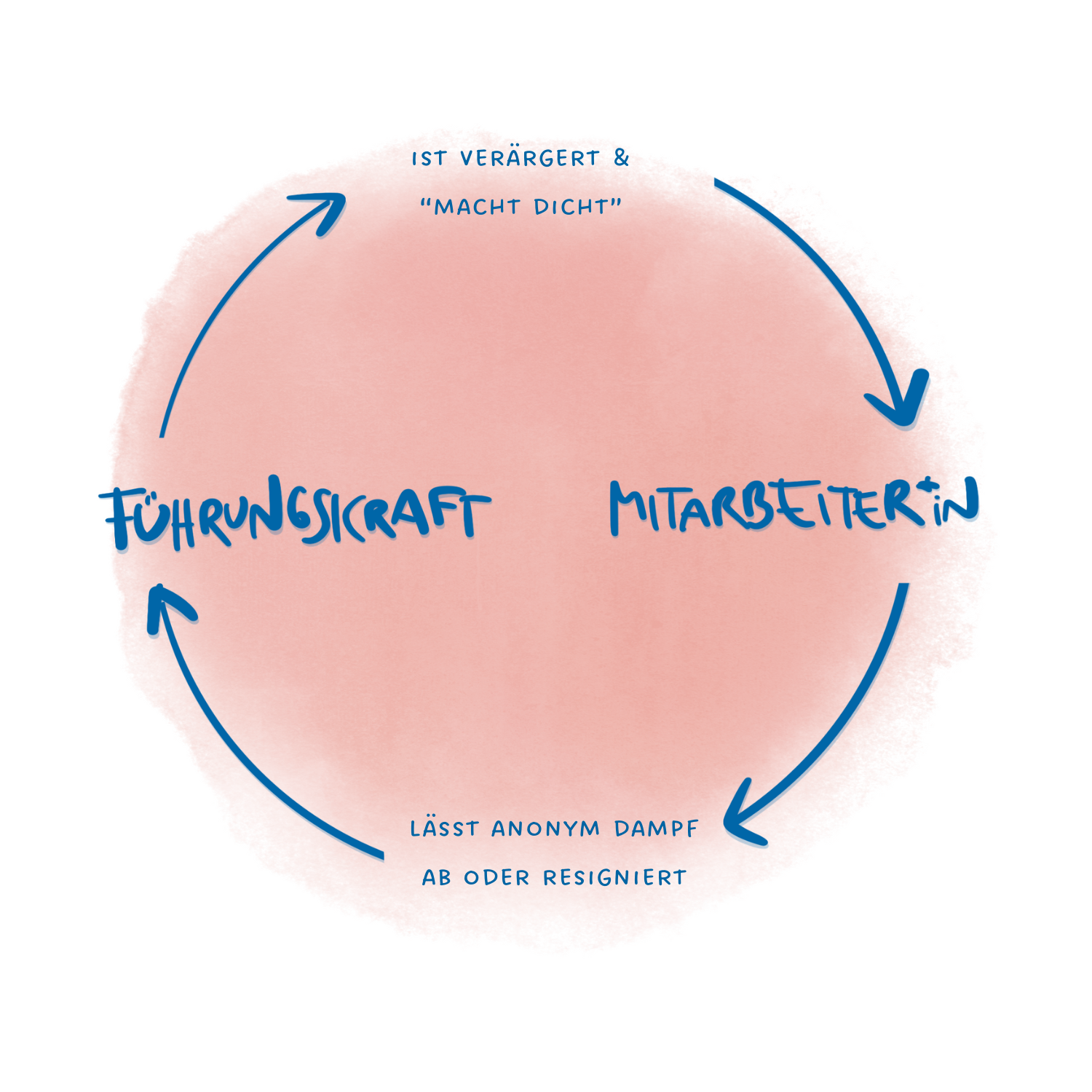 Will man das als interner Moderator machen, kostet das unheimlich Energie. Und Zeit. Denn Vertrauen wächst nicht von heute auf morgen, das weiß man ja. Für die Mitarbeiter ist der konstruktive Umgang mit den anonymen Kommentaren und Bewertungen der Schlüssel: „Beweis mir, dass du es ernst nimmst, dann traue ich mich irgendwann auch direkt.“ Für ungeduldige Führungskräfte ist es genau andersherum: „Trau dich, Probleme offen anzusprechen, sonst kann ich nichts ändern.“ Und somit haben wir ein klassisches Beispiel für ein zirkuläres Problem:
