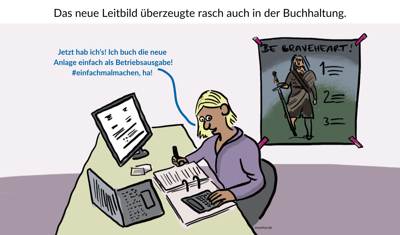 Eine Buchhalterin setzt den Leitbild-Grundsatz „Be Braveheart“ um, indem sie Abschreibungsobjekte als Betriebsausgabe bucht.